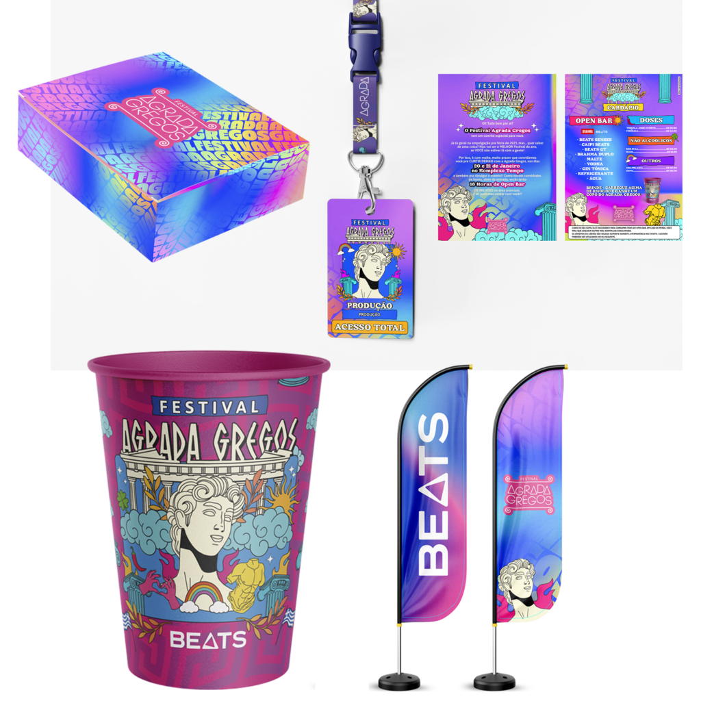 Além disso, fui responsável pelo desenvolvimento de uma variedade de materiais para a comunicação visual do festival. Isso incluiu a criação de cardápios personalizados, pulseiras de identificação, copos temáticos, tirantes e kits influenciadores, entre outros itens. Cada peça foi projetada com atenção aos detalhes e à coesão visual, garantindo uma experiência consistente e memorável para os participantes.