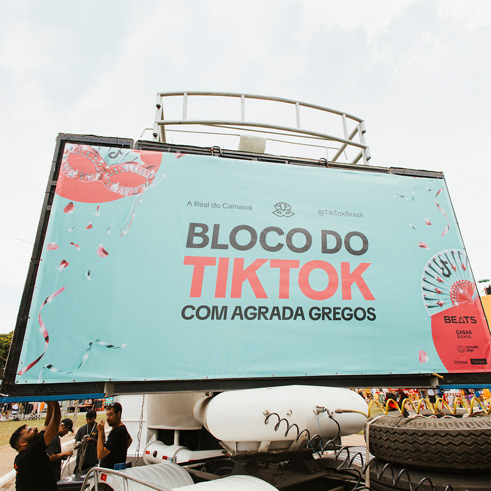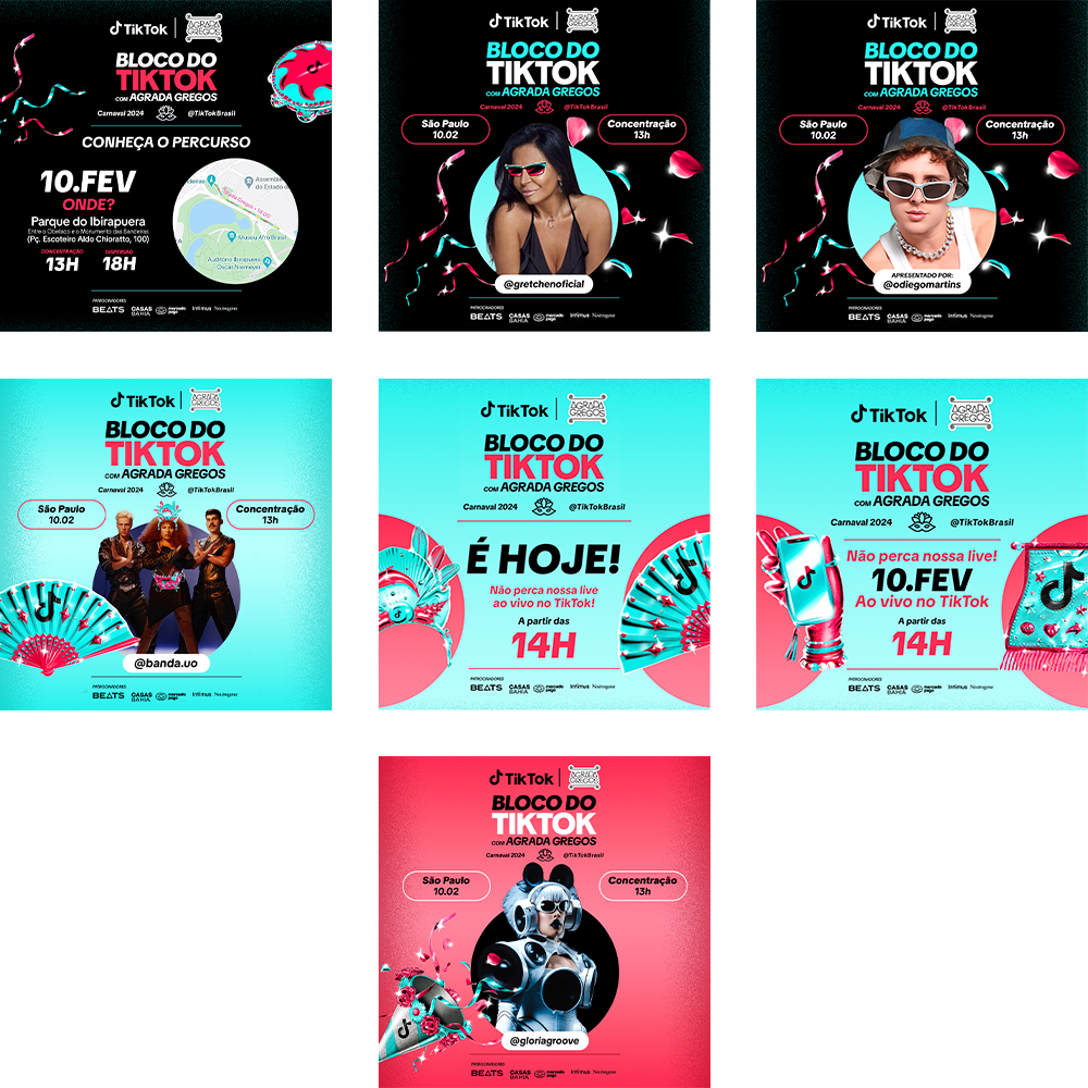 O desafio era desenvolver materiais de comunicação visual que não só refletissem a energia contagiante e inclusiva do bloco de carnaval, mas também capturassem a essência da plataforma TikTok – criativa, autêntica e envolvente.